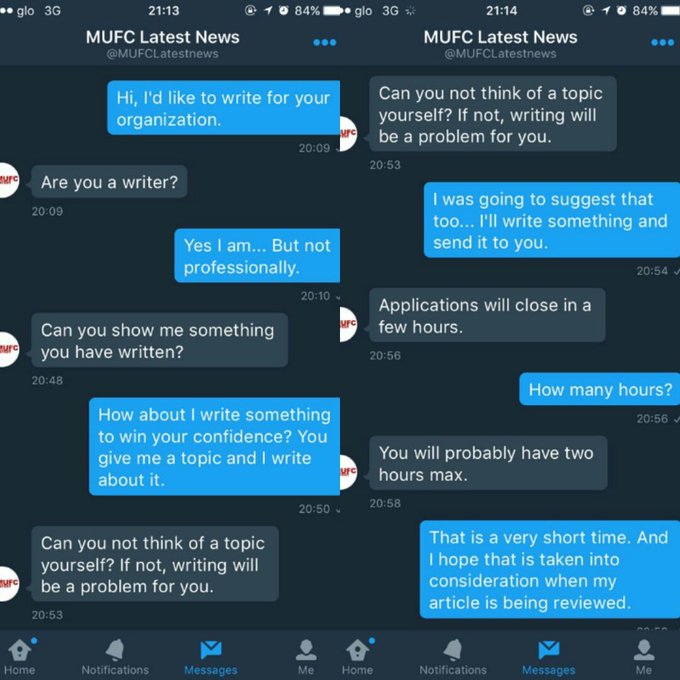 A Nigerian man named, David Ade @Dayveed_Ade recently contacted Manchester United News @MUFCLatestNews on twitter for a writing job, after he saw an advert the account published.